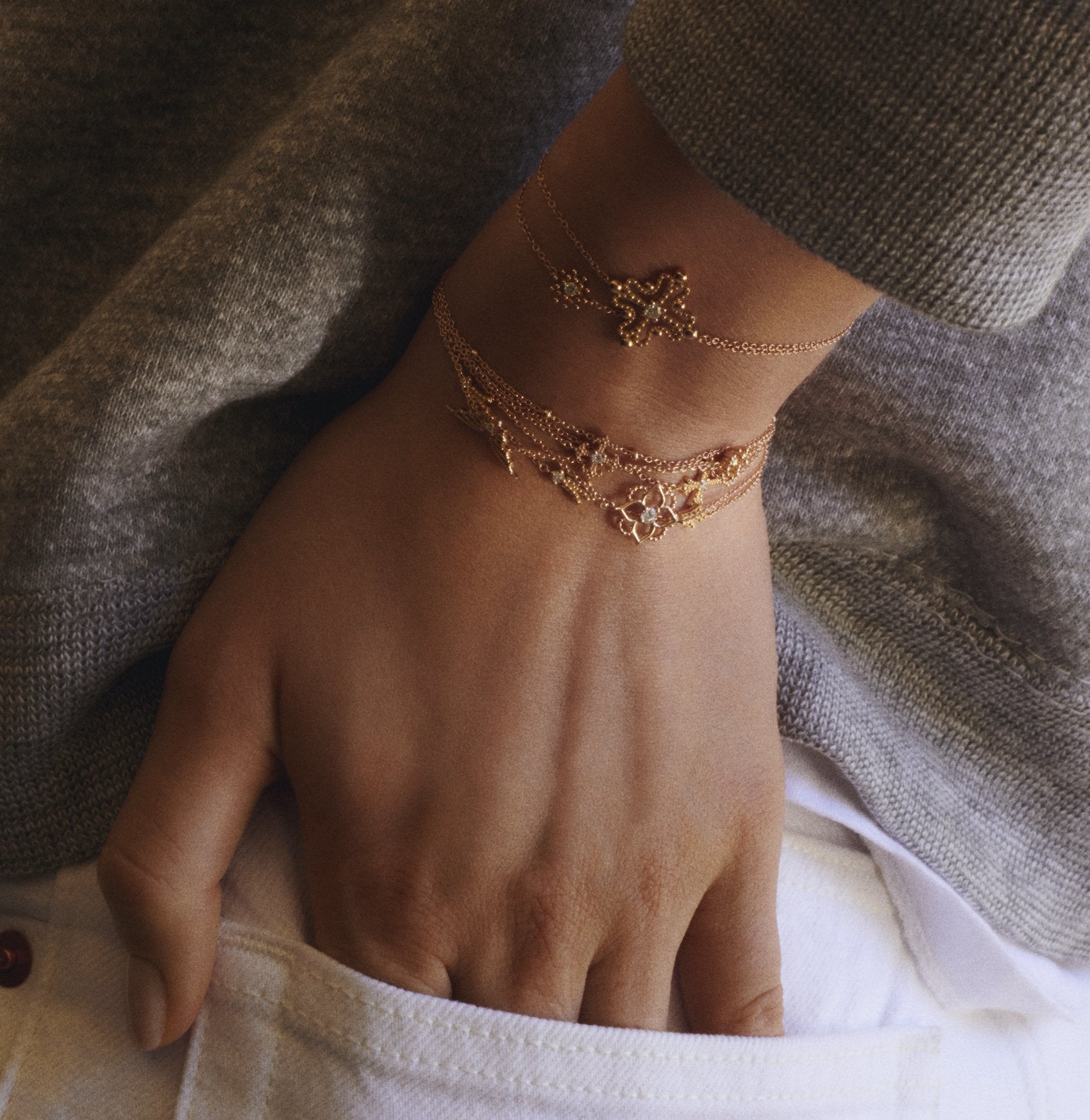 メレリオのファインジュエリーブレスレットは、あらゆる手元を美しく引き立てるようにデザインされており、さまざまなスタイルに調和する豊かなバリエーションが揃っています。ミューズコレクションのジュエリーブレスレットラインは、ロール=イザベル・メレリオによってメゾンのアーカイブを再解釈したもので、伝統と現代性を融合させた作品を展開しており、メレリオならではの魅力が表現されています。